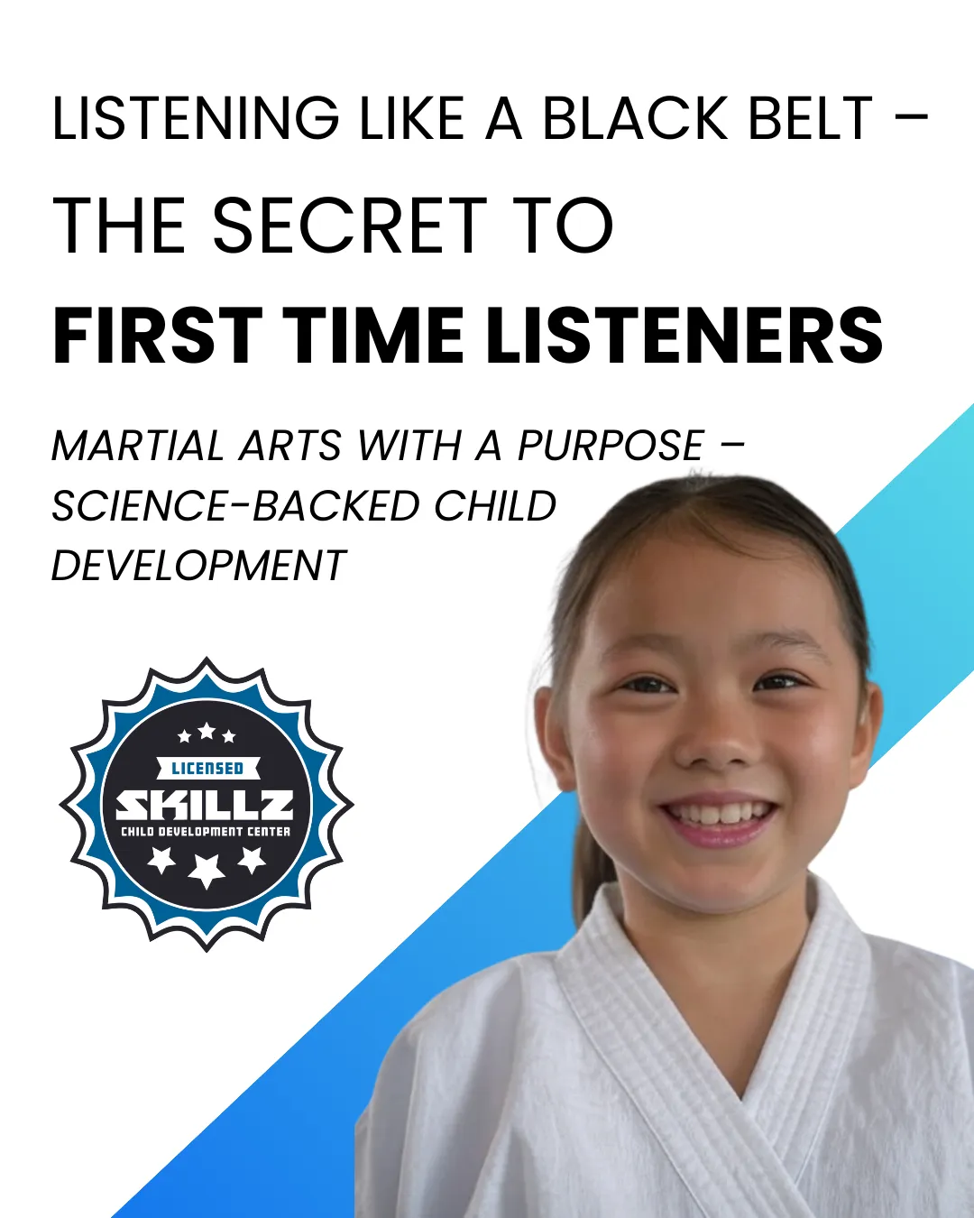 In our kids martial arts class… We teach kids to be still, to listen, and to act—the three pillars of discipline. We teach them early ‘listening positions’ that they’ll use in class and in life.